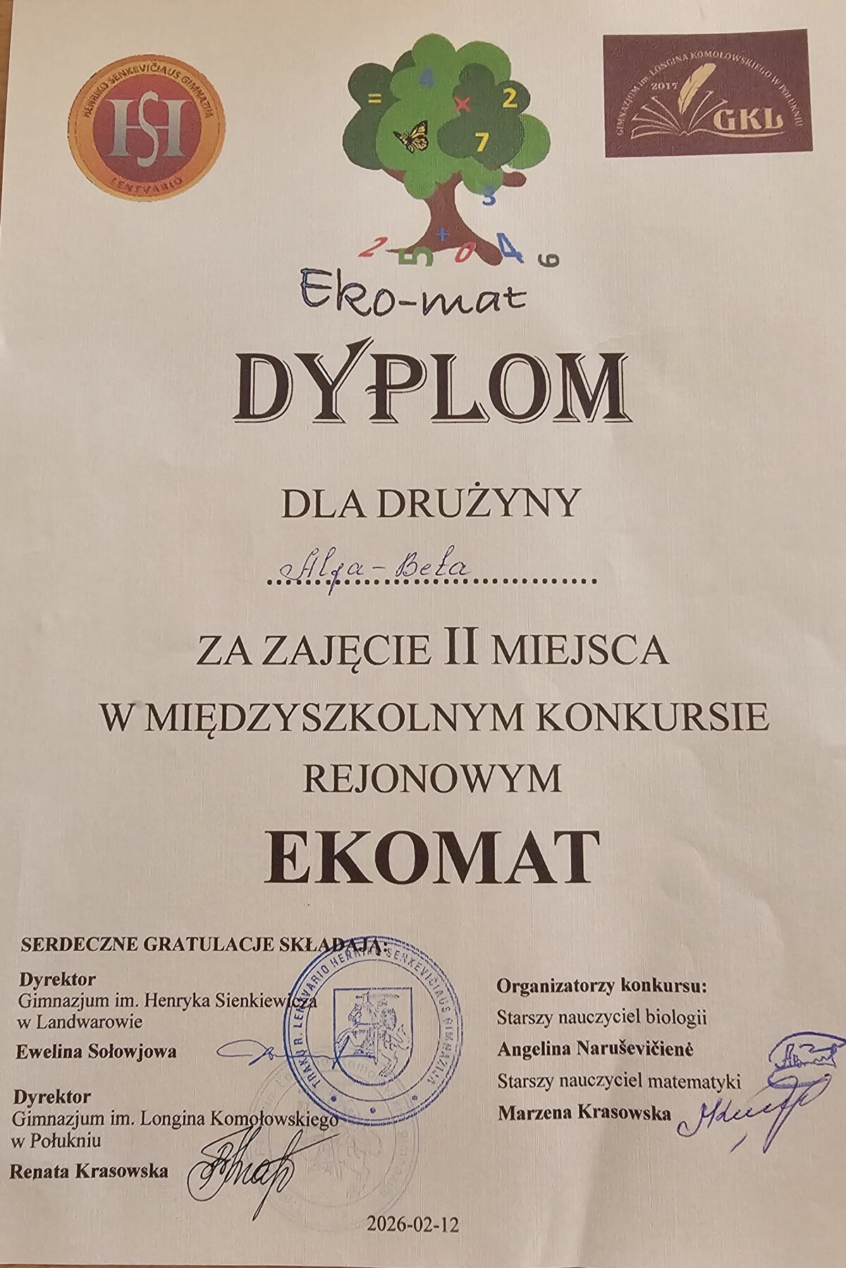 12 lutego 2026 roku drużyna Alfa-Beta z Gimnazjum w Trokach, wraz ze swoją nauczycielką Łucją Griniewicz, wyruszyła na rejonowy konkurs matematyczno-biologiczny Ekomat. Wydarzenie zgromadziło młodych pasjonatów nauki z wielu szkół, a uczestnicy mieli okazję zmierzyć się z różnorodnymi zadaniami łączącymi świat liczb i przyrody.