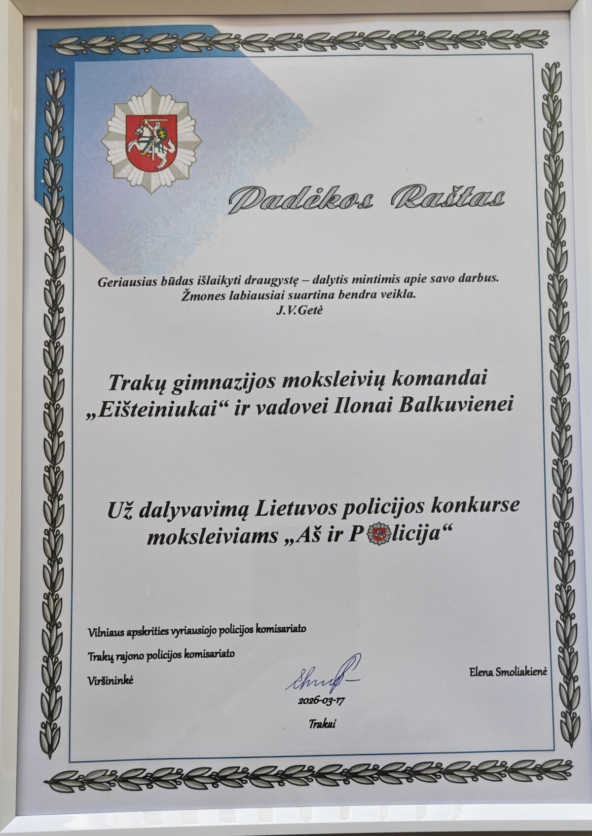 Šių metų saulėtą kovo 17d. Trakų gimnazijos, IIIG mokiniai: Dominika Tomaševič, Sebastian Balkevič, Beata Baranovska ir Daniel Kirijaček dalyvavo Lietuvos policijos konkurse ,,Aš ir Policija". Protmūšio metu mokiniai pagilino žinias kaip elgtis ekstremalių situacijų metu, prisiminė atsakomybes ir pareigas, plačiau susipažino su specialiųjų operacijų rinktinės ,,Aras" veikla. Komanda Einšteiniukai draugiškai ir aktyviai atsakinėjo į klausimus bei džiaugėsi gautomis dovanomis.