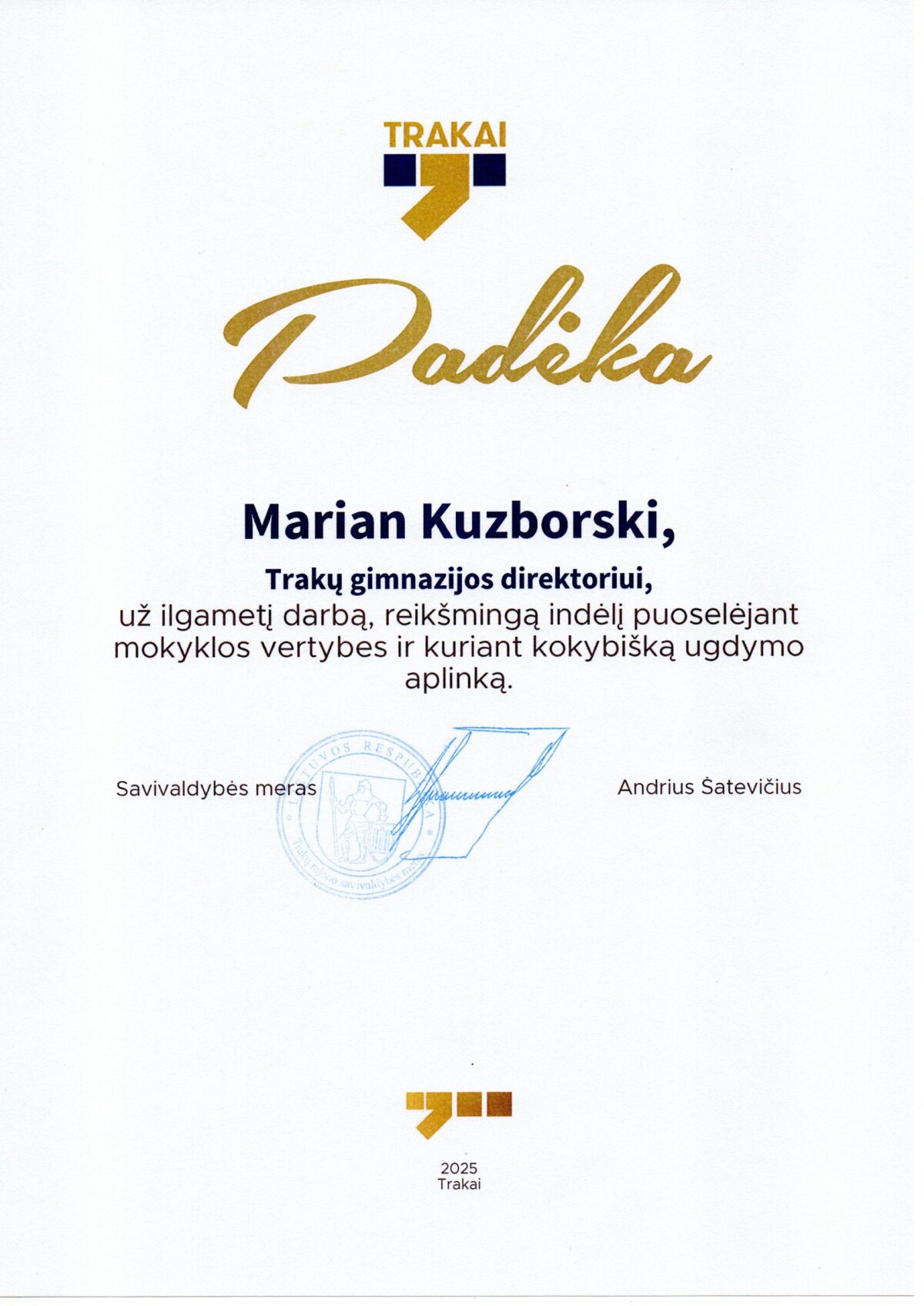 Atėjo metas su Jumis atsisveikinti. Baigdamas savo darbą mokyklos direktoriaus pareigose, norėčiau nuoširdžiai padėkoti už bendrą laiką, bendradarbiavimą ir atsidavimą, kurį jaučiau kiekvieną dieną. Tai buvo laikotarpis, kupinas iššūkių, bet taip pat ir daugybės pasiekimų, kurie nebūtų buvę įmanomi be Jūsų profesionalumo, aistros ir atsakomybės.