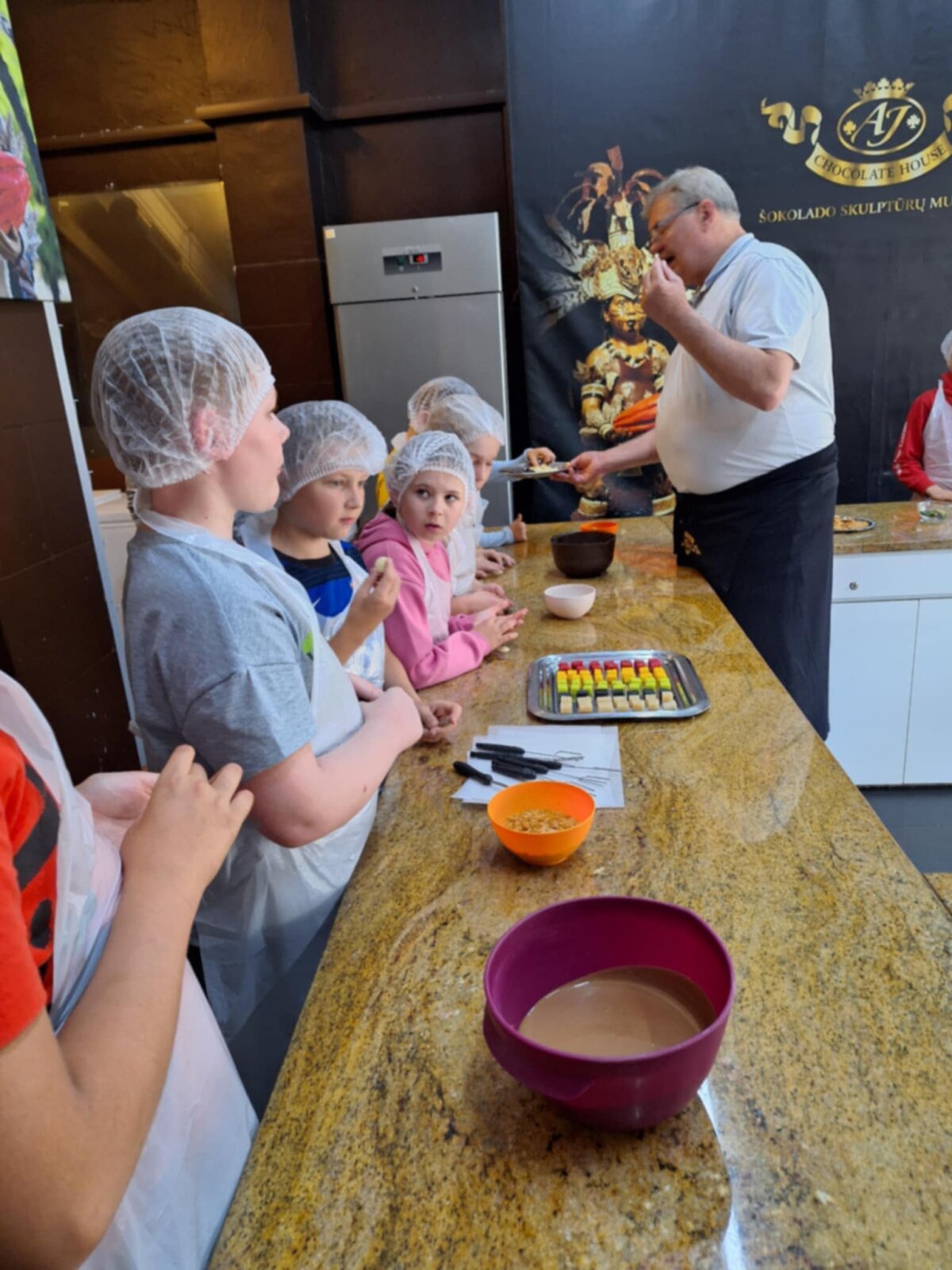 Kitą dieną 1-4 klasių mokiniai lankėsi A. J. Šokolado sostinėje ir sužinojo visą šokolado gamybos kelią, patys pasigamino saldainių, taip pat jie aplankė šokoladinių skulptūrų muziejų, atsakinėjo į viktorinos klausimus, gavo pažymėjimus.