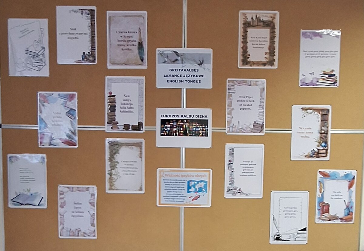 Rugsėjo 26 dieną gimnazijoje paminėjome Europos kalbų dieną – šiemet kitaip, bet itin smagiai ir įsimintinai. Kalbų mokytojai bei dailės ir technologijų mokytoja Danuta Jepifanova parengė informatyvius stendus apie kalbų įvairovę, jų naudą ir įdomius faktus įvairiomis mūsų gimnazijoje dėstomomis kalbomis. Kitas stendas kvietė išbandyti liežuvį su greitakalbėmis – mokiniai su smalsumu ir juoku bandė jas tarti skirtingomis kalbomis. Mokiniai ir kalbų mokytojai ištrūko iš įprastos aplinkos ir kūrybiškai pažvelgė į kalbų mokymąsi, nes pamokos vyko įvairiose gimnazijos erdvėse. Per pertraukas skambėjo populiarios dainos įvairiomis kalbomis – tai sukūrė šventišką, linksmą atmosferą, o kai kurie mokiniai net šoko koridoriuose. Tokia netradicinė diena visiems labai patiko ir įkvėpė dar labiau domėtis kalbų pasauliu.