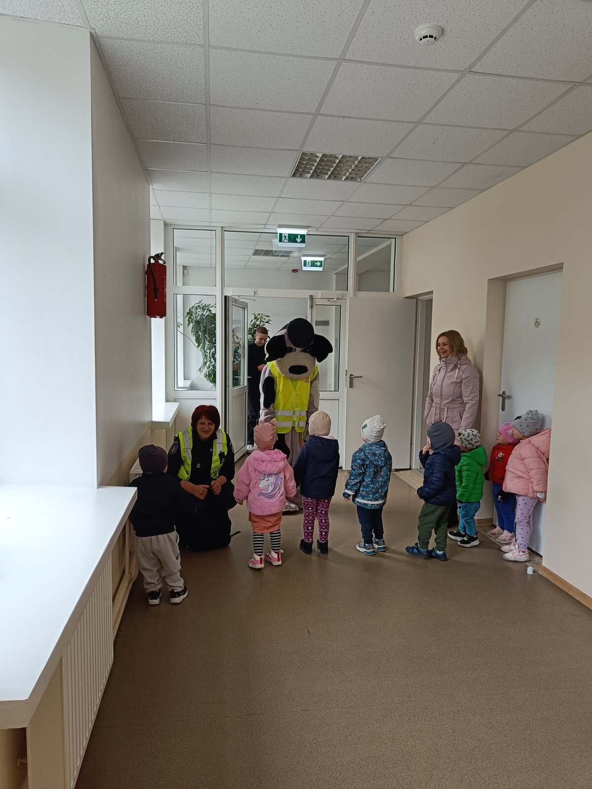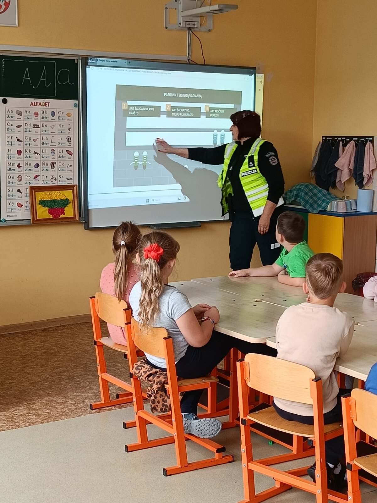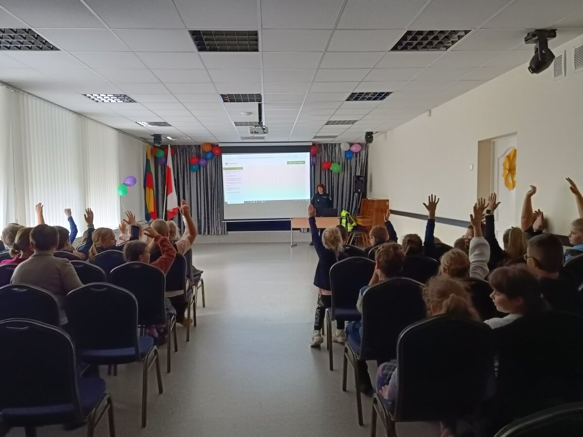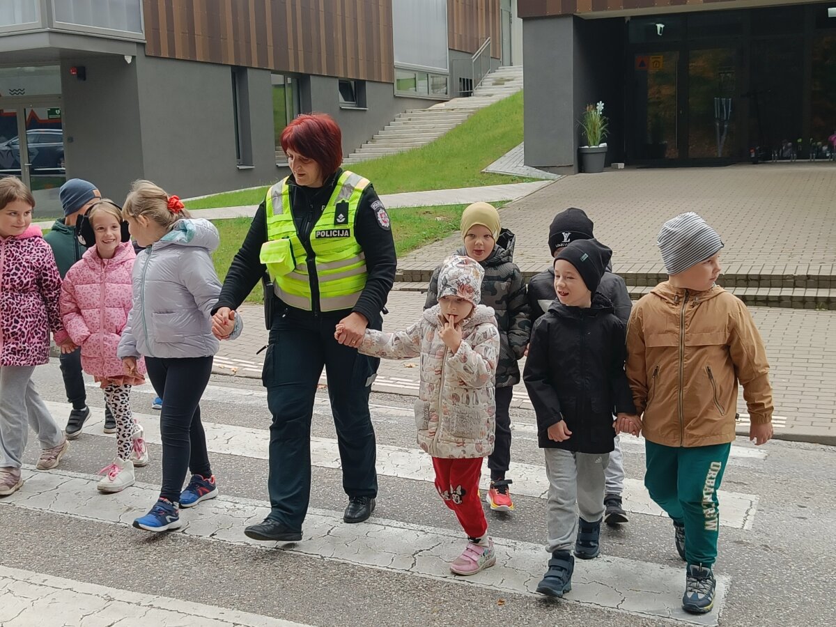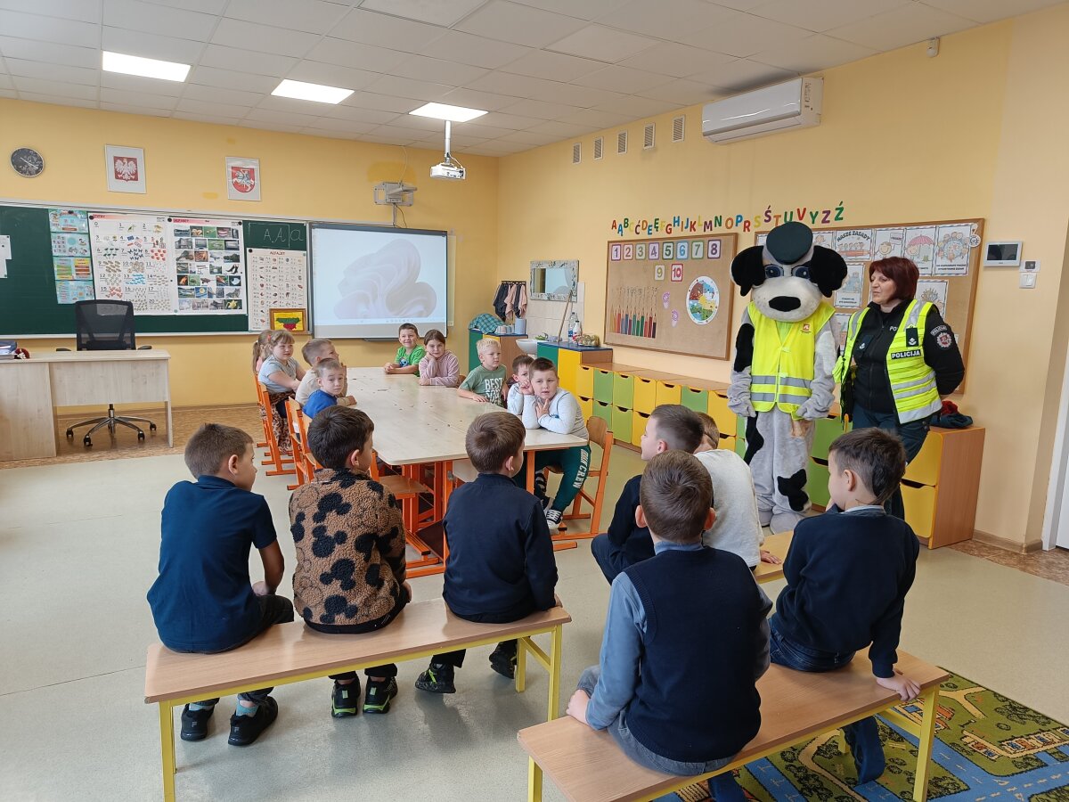 Spalio 7 dieną priešmokyklinės grupės vaikai ir 2–4 klasių mokiniai sulaukė ypatingų svečių – bendruomenės pareigūnės ir policijos šuniuko Amsio. Pareigūnė Vlada Černienė mokiniams papasakojo apie saugų elgesį gatvėje, kaip teisingai pereiti per pėsčiųjų perėją, kodėl svarbu segėti atšvaitus. Pareigūnė vaikams paaiškino, kur galima važiuoti dviračiu ar paspirtuku, kodėl svarbu segėti šalmą, dėvėti ryškius ar atšvaitus turinčius drabužius, laikytis kelių eismo taisyklių. Didelio susidomėjimo sulaukė interaktyvi dalis, kur vaikai sprendė saugaus eismo užduotis. Mokiniai aktyviai dalyvavo diskusijose, atsakinėjo į klausimus ir dalijosi savo patirtimi. Susitikimas buvo jaukus, smagus ir tuo pačiu – labai prasmingas. Tokie susitikimai padeda mokiniams įtvirtinti teorines žinias, skatina saugų, atsakingą elgesį kelyje ir moko rūpintis savo bei kitų saugumu.