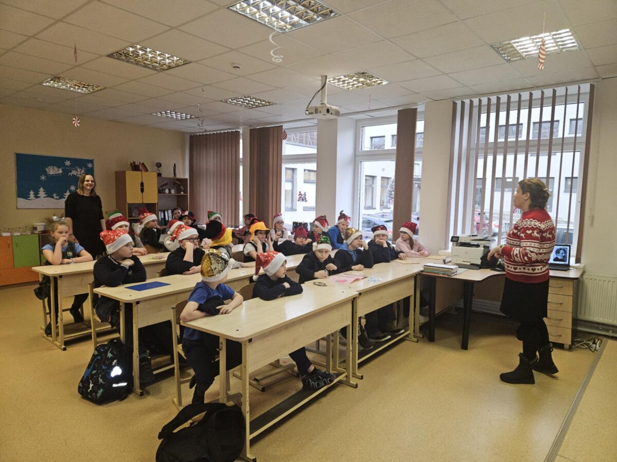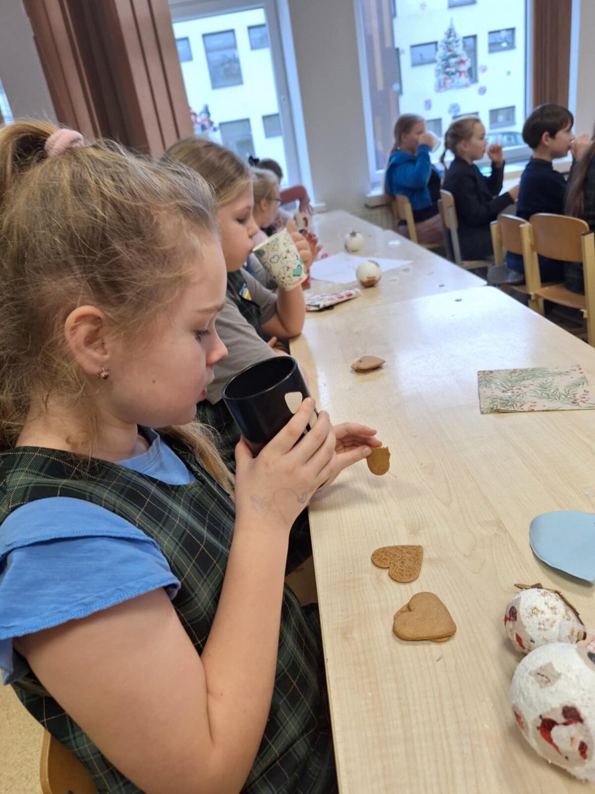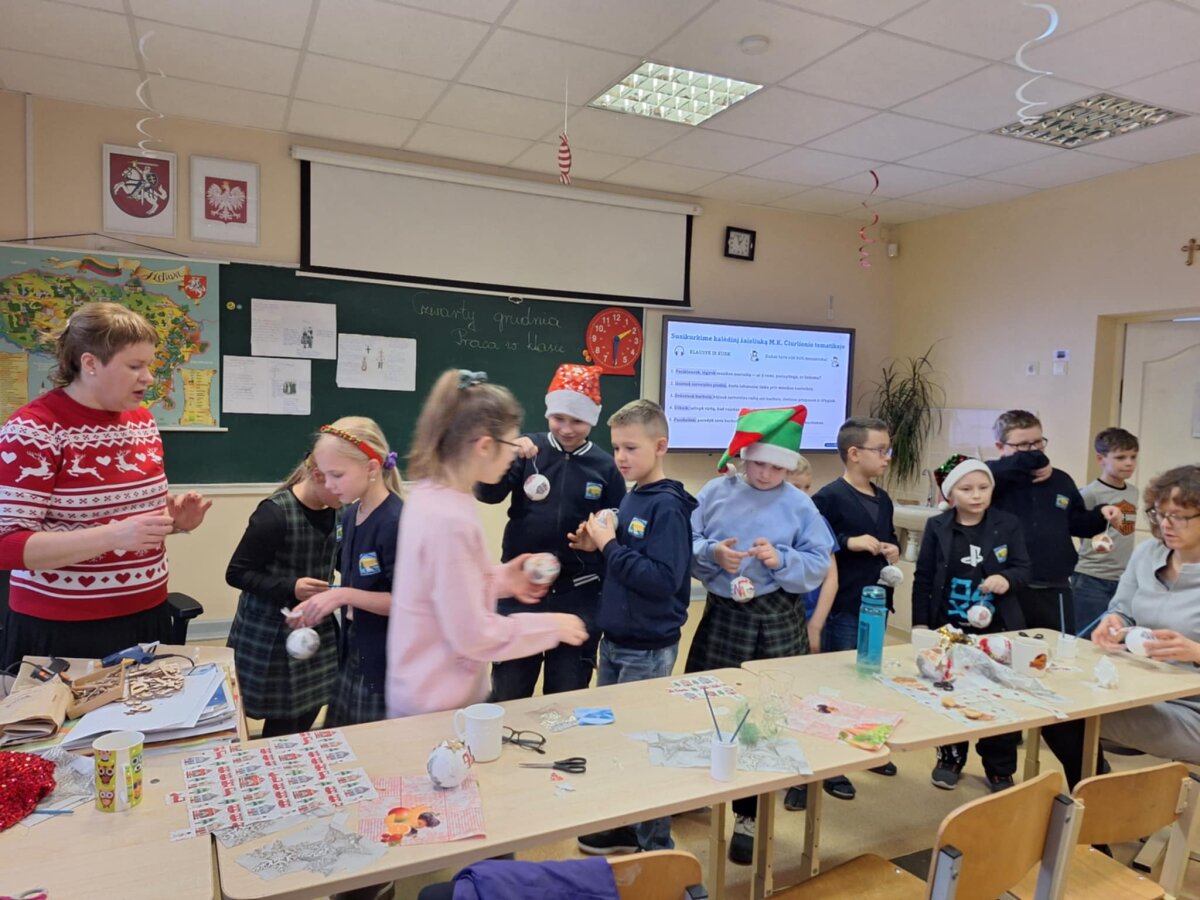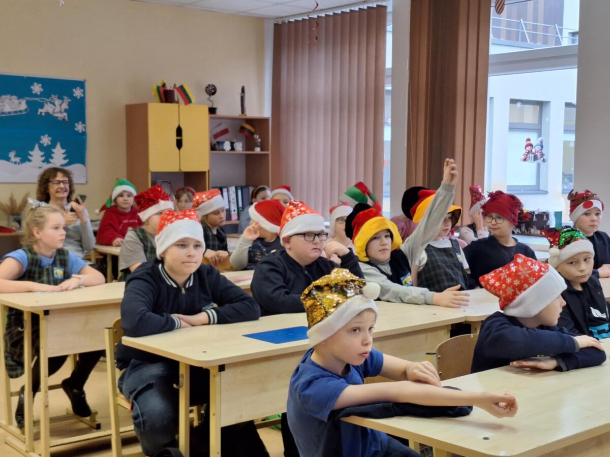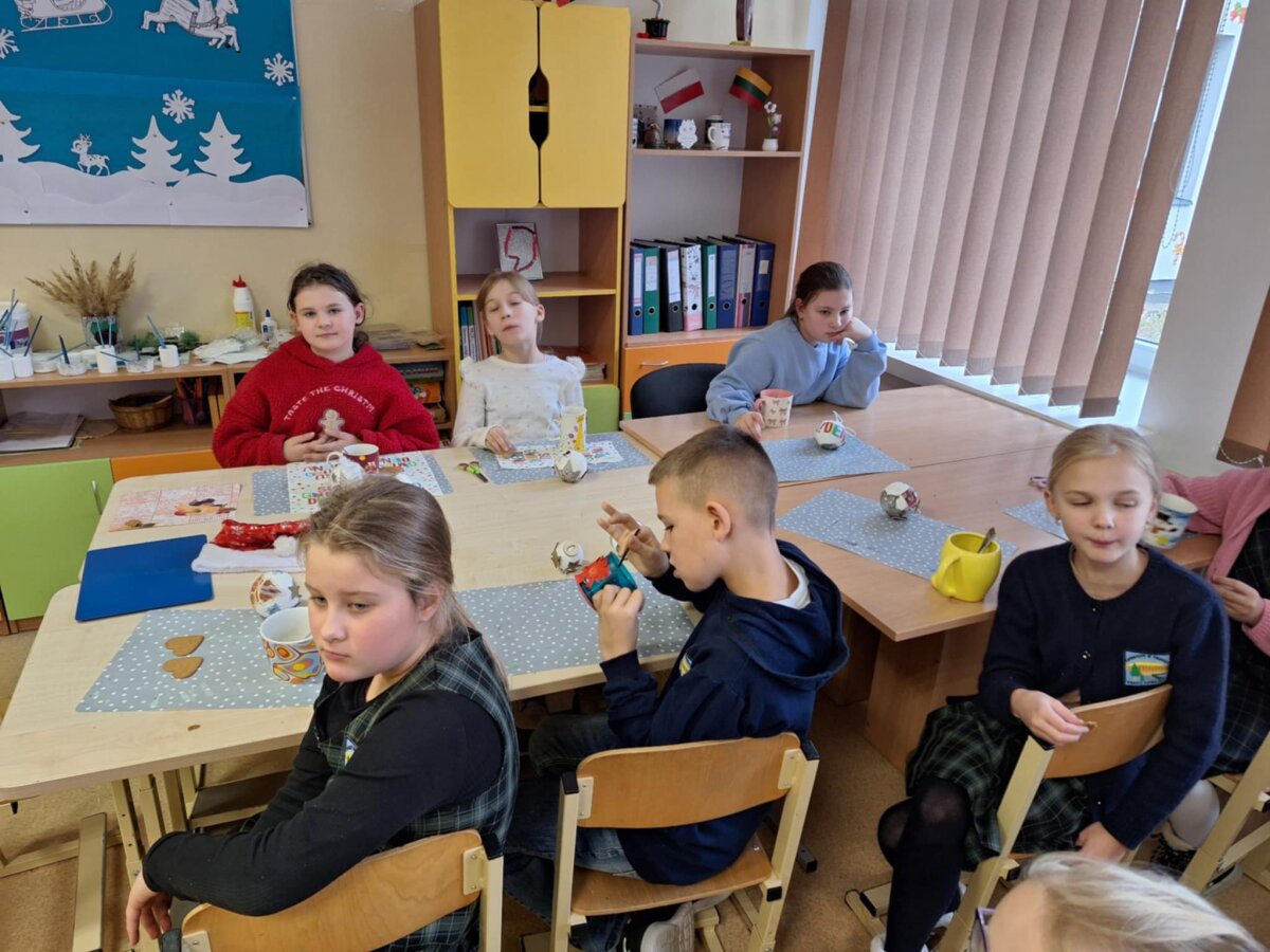 4 grudnia uczniowie klas początkowych wzięli udział w przedświątecznej edukacji „Święta i kolory z M. K. Čiurlonisem“. Dzieci miały doskonałą możliwość bardziej poznać tradycje Świąt Bożego Narodzenia, twórczo zintegrowane z muzyką i obrazami M. K. Čiurlonisa. Celem edukacji było promowanie dziedzictwa kulturowego, rozwijanie twórczości u dzieci, stwarzanie razem nastroju i magii świąt. Uczniowie udekorowali bombki , a panie edukatorki, na zakończenie zajęcia, poczęstowały uczestników ziołową herbatą z imbirowymi ciasteczkami.