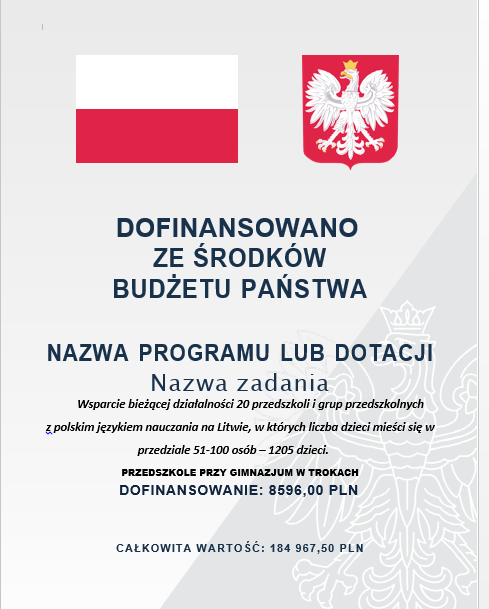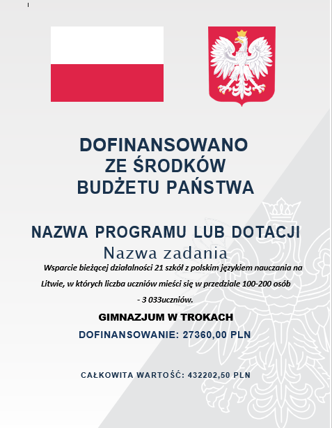 Gimnazjum w Trokach bierze udział w realizacji IX etapu projektu dopasażenia szkół oraz grup przedszkolnych przy szkołach w 2022 roku. IX etap projektu jest finansowany przez Fundację ,,Pomoc Polakom na Wschodzie” ze środków Kancelarii Prezesa Rady Ministrów Rzeczypospolitej Polskiej.